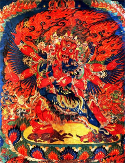 马头明王一面表示空性,二臂表示智悲双运,三目圆睁表示降伏三界恶魔,獠牙可怖势态表示具有众生无明业障,摧破诸恐怖而现形。右手持骷髅宝杖表示灭伏一切魑魅之恶业,左手以期克印表示除断一切恶障。头戴五骷髅冠表示五佛性能,双足右屈左伸表示降伏烦恼、蕴、天子、死等四魔之意。