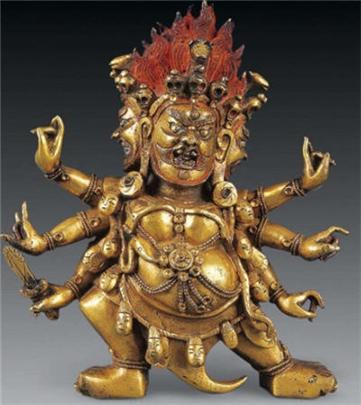 观想马头金刚的形象:马头金刚佛父有红白兰三头,六臂分别执持法器。胸前左手持托巴,里面充满甘露血。右手持花。双手也是持印的姿态。其他分别持宝剑,绳索,宝杖,长柄钺刀。头顶是蓝色马头。足下踩魔子魔女。佛母蓝色,左手持甘露血托巴,右手勾佛父脖子。佛父、佛母头戴五骷髅冠。