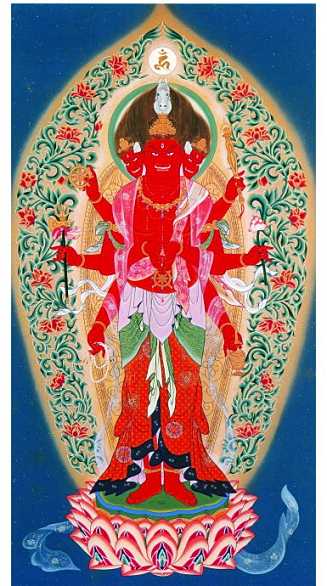 马头明王如观音菩萨为自性身,示现大忿怒形,置马头于顶,为观世音菩萨的变化身之一。因为慈悲心重,所以摧灭一切魔障,以大威日轮照破众生的暗冥,啖食众生的无明烦恼。