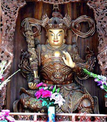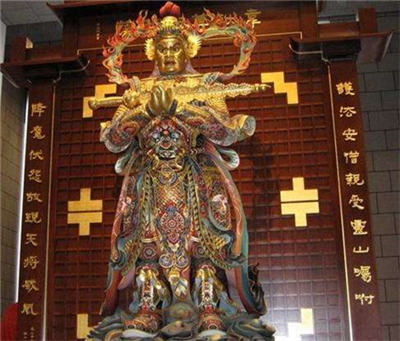 韦驮菩萨是贤劫千佛当中的最后一尊佛。他往劫里跟释迦佛他们同为转轮圣王的千子,转轮圣王他有一千个儿子,同为千子同为兄弟。然后这些千子学佛之后各个发愿,当时的韦驮菩萨听了他们的发愿之后,他就说:“你们修行成道,弘扬佛法的时候我给你们做护法,护持你们,等你们全部成佛之后,我最后一个成佛。” 所以转轮圣王的千子成为我们贤劫的千佛,楼至佛就成为最后一尊,名字叫楼至佛。供奉:每天三柱香,农历十八,十五日、将"舍利盐"放在俱攞钵过滤溶化后擦拭神像,诚心修行俱攞钵表面会慢慢生长如树根桩一样的物质。韦陀菩萨手上拿的是降魔杵,他是护法神,代表护法。手上拿的杵,就是武器。而拿的姿势有多种,有菩萨合掌,宝杵放在手背上,也有菩萨手垂下来,宝杵在手掌中。一般韦陀菩萨塑像都是立像,代表恭敬保护道场、保护修行人。只有东天目山的韦陀菩萨是坐像,这是一个特殊的例子,因为东天目山是韦陀菩萨自己的道场,那是他自己的家,当然可以坐在当中。而韦陀菩萨在别的地方护法,多半是立像,很少看到坐像。